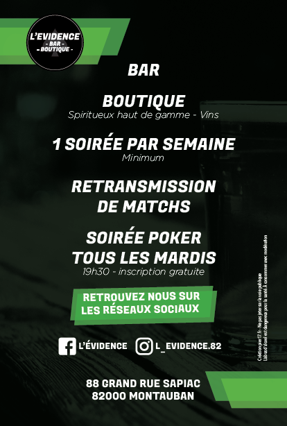 Lorsque Romain ROQUES, ex-joueur sapiacain jusqu’en 2006, nous a proposé de nous accueillir dans son établissement, cela nous est apparu comme une EVIDENCE tant le personnage est attachant et attaché à notre association. C’est donc dans son nouveau BAR nommé L’EVIDENCE, que désormais se dérouleront nos apéros, nos barbecues, nos réunions du bureau, nos réceptions des supporters adverses, nos 3e mi-temps voire 4e parfois ….